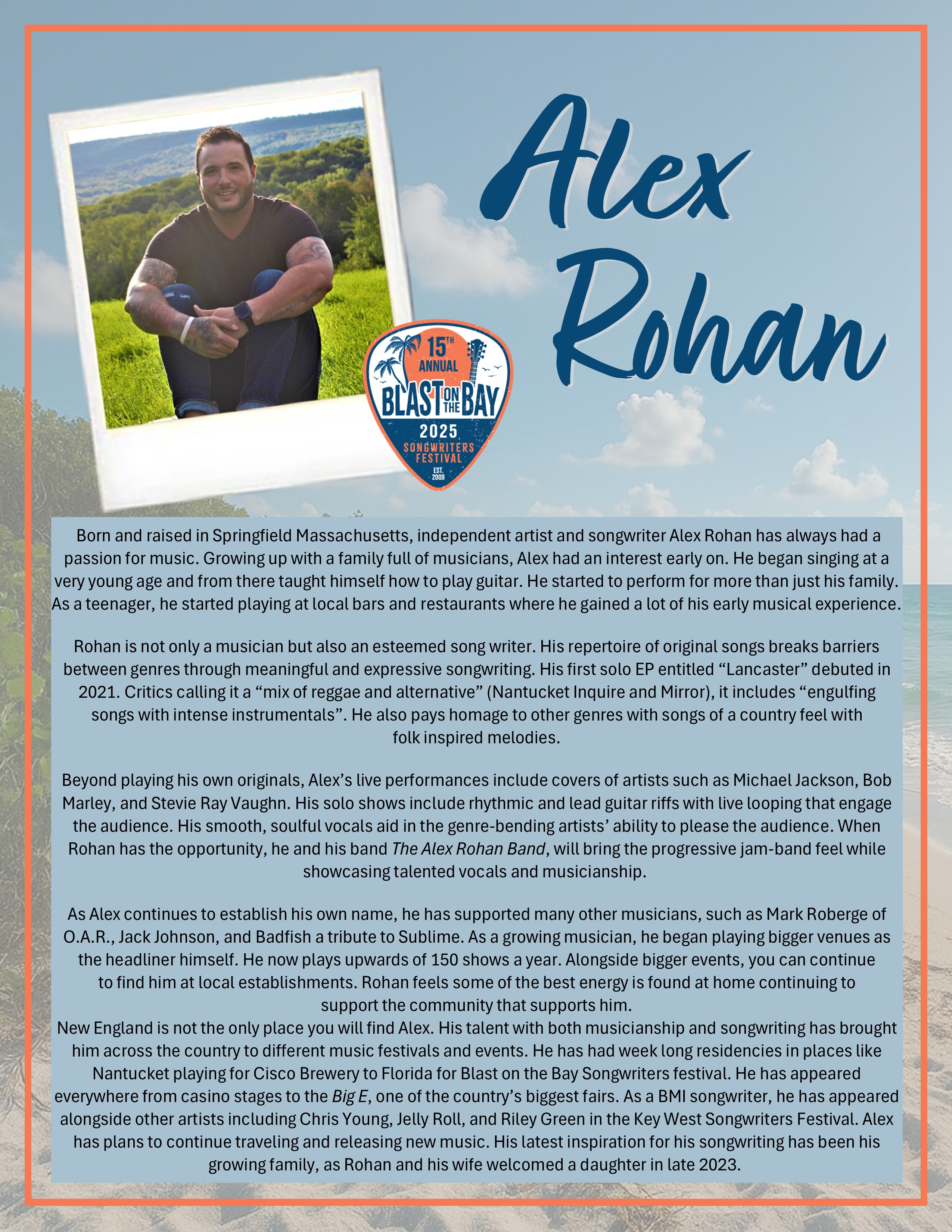 Born and raised in Springfield, Massachusetts, independent artist and songwriter Alex Rohan has always had a passion for music. Growing up with a family full of musicians, Alex had an interest early on. He began singing at a very young age and, from there, taught himself how to play the guitar. He started to perform for more than just his family. As a teenager, he started playing at local bars and restaurants where he gained a lot of his early musical experience.
